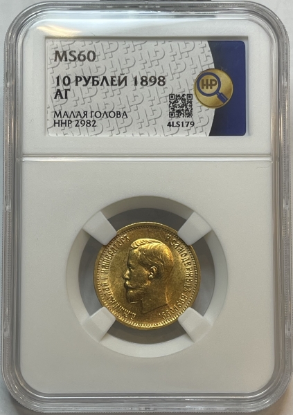 В центре изображен Малый Государственный Герб Российской империи - двуглавый орёл, головы которого увенчаны двумя коронами, третья, большая корона над ними. Все они соединены орденской лентой ордена Св. Апостола Андрея Первозванного. На груди орла расположен Московский герб, в щите изображен Георгий Победоносец с копьем поражающий дракона. Вокруг щита цепь ордена Св. Апостола Андрея Первозванного. На крыльях изображены гербы: Царства Казанского, Польского, Херсонеса Таврического, Астраханского, Сибирского, Грузинского, герб соединенных княжеств Киевского, Новгородского и Владимирского и герб Великого Княжества Финляндского — по 4 на каждое крыло. В правой лапе орла – скипетр, в левой – держава. Под ним слева направо изображены: номинал - надпись «10 РУБЛЕЙ» и дата выпуска «1898 Г.». По окружности канта имеются рельефные элементы, выполненные в виде зубцов.