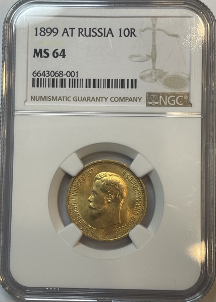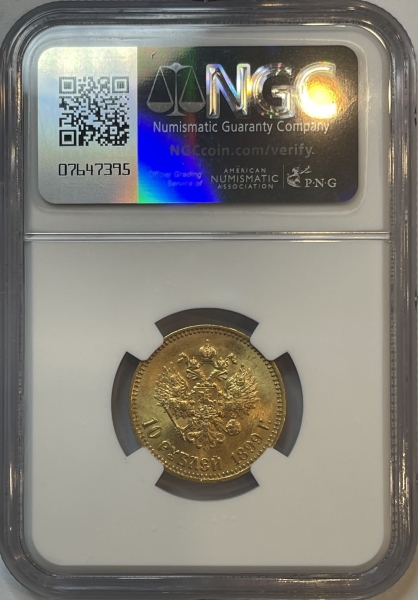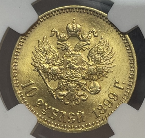 В центре изображен Малый Государственный Герб Российской империи - двуглавый орёл, головы которого увенчаны двумя коронами, третья, большая корона над ними. Все они соединены орденской лентой ордена Св. Апостола Андрея Первозванного. На груди орла расположен Московский герб, в щите изображен Георгий Победоносец с копьем поражающий дракона. Вокруг щита цепь ордена Св. Апостола Андрея Первозванного. На крыльях изображены гербы: Царства Казанского, Польского, Херсонеса Таврического, Астраханского, Сибирского, Грузинского, герб соединенных княжеств Киевского, Новгородского и Владимирского и герб Великого Княжества Финляндского — по 4 на каждое крыло. В правой лапе орла – скипетр, в левой – держава. Под ним слева направо изображены: номинал - надпись «10 РУБЛЕЙ» и дата выпуска «1899 Г.». По окружности канта имеются рельефные элементы, выполненные в виде зубцов.