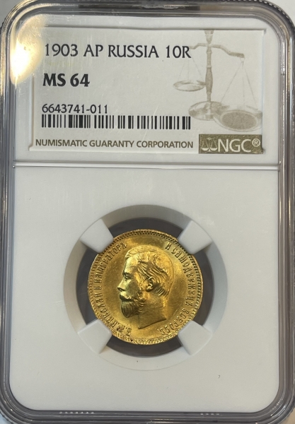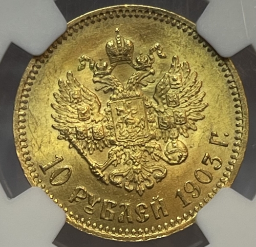 В центре изображен Малый Государственный Герб Российской империи - двуглавый орёл, головы которого увенчаны двумя коронами, третья, большая корона над ними. Все они соединены орденской лентой ордена Св. апостола Андрея Первозванного. На груди орла расположен Московский герб - щит с изображением Георгия Победоносца с копьём поражающего дракона. Вокруг щита цепь ордена Св. апостола Андрея Первозванного. На крыльях изображены гербы: Царства Казанского, Польского, Херсонеса Таврического, Астраханского, Сибирского, Грузинского и герб соединенных княжеств Киевского, Новгородского и Владимирского — по 4 на каждое крыло. В правой лапе орла – скипетр, в левой – держава. Под ним слева направо изображены: номинал - надпись «10 РУБЛЕЙ» и дата выпуска «1903 Г.». По окружности канта имеются рельефные элементы, выполненные в виде зубцов.