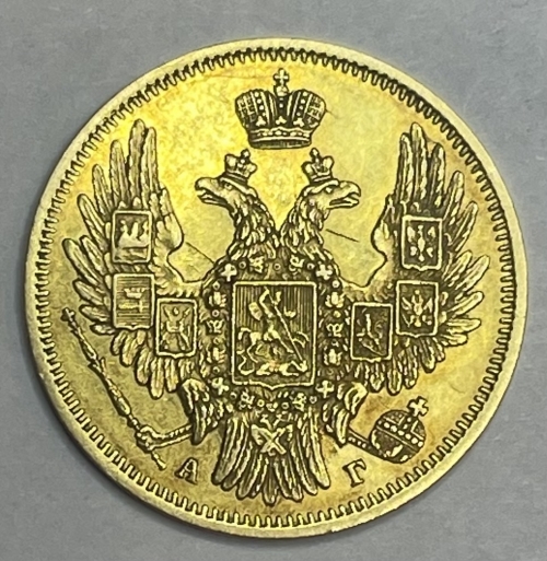 В центре указан номинал «5», ограниченный с обеих сторон пятиконечными цветочными розетками. Под цифрой номинала — слово "РУБЛЕЙ". Ниже, расположен декоративный разделитель в виде двух разнонаправленных фигурных линий и небольшой выпуклой восьмиконечной звезды между ними. Под разделителем — дата выпуска монеты «1849». Под цифрой даты — обозначение монетного двора «С.П.Б.». Центральная часть отделена от остального изображения, окружностью в виде точек. За окружностью круговая надпись: «ЧИСТОГО ЗОЛОТА 1 ЗОЛОТНИК 39 ДОЛЕЙ», разделенная сверху цветочной розеткой. По окружности канта имеются рельефные элементы, выполненные в виде зубцов.