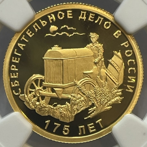 на зеркальном поле диска – рельефное изображение механизатора, работающего в поле на тракторе, вдоль канта – надписи, вверху: "СБЕРЕГАТЕЛЬНОЕ ДЕЛО В РОССИИ", внизу: "175 ЛЕТ".