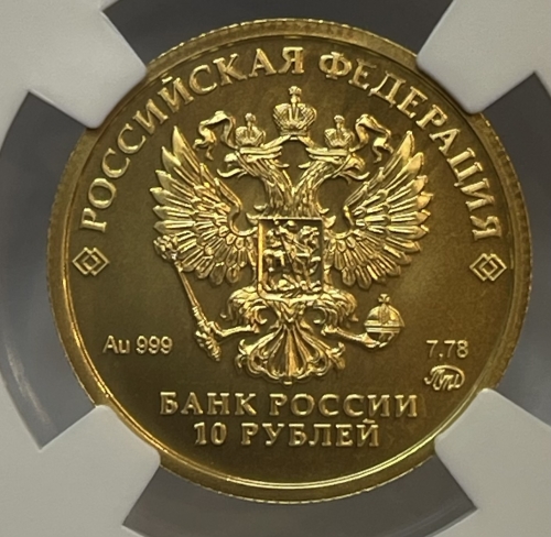 в центре – рельефное изображение Государственного герба Российской Федерации, над ним вдоль канта – надпись полукругом: «РОССИЙСКАЯ ФЕДЕРАЦИЯ», обрамленная с обеих сторон сдвоенными ромбами, внизу под гербом: слева – обозначения драгоценного металла и пробы, справа – содержание химически чистого металла и товарный знак монетного двора, внизу в центре в две строки – надпись: «БАНК РОССИИ», номинал монеты: «10 РУБЛЕЙ».