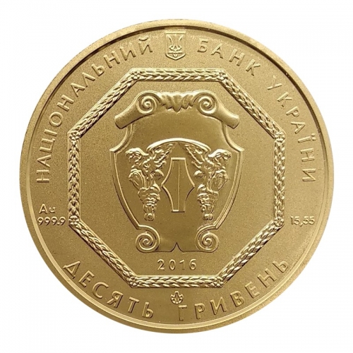 В центре, в восьмиугольном картуше на щите, изображена эмблема Национального банка Украины, состоящая из алегоричныхфигур грифонов, между которыми изображена гривна- денежно-весовая единица Киевской Руси.Эта эмблема символизирует сохранность и приумножение золотого запаса государства. Кроме того, на аверсе монеты размещены номинал монет, год чеканки, а также название металла, проба и его чистая масса.