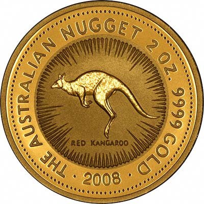 Реверс: Изображение кенгуру — символа пятого континента. Изображение меняется каждый год. Надпись AUSTRALIAN KANGAROO — австралийский кенгуру. Также указаны год выпуска монеты, вес 1 oz и 0.9999 проба золота. На монете 2007 года есть надпись THE AUSTRALIAN NUGGET, откуда и пошло название монеты.