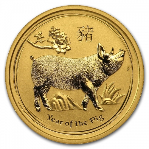 На реверсе золотой монеты представлено изображение обычной пятнистой свиньи с поднятой вверх головой, которая пасётся на лугу. На этой же стороне можно увидеть китайский символ "свинья" и надпись на английском "Year of the Pig". Буква "Р" означает монетный двор в городе Перт. На аверсе монеты можно увидеть портрет британской королевы Елизаветы Второй, год выпуска, чистоту золота и номинал монеты.