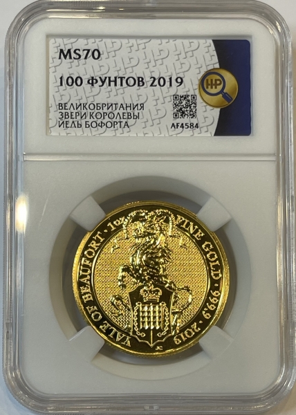 Золотая монета Великобритании 100 фунтов "Йель Бофорта" 2019 года 31,1 г. в слабе ННР MS 70